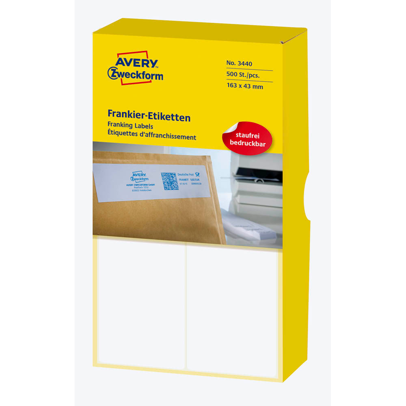 Die Frankieretiketten 3440 mit den Maßen 163,0 x 43,0 mm (BxH) überzeugen durch ihre bewährte Made in Germany-Qualitä