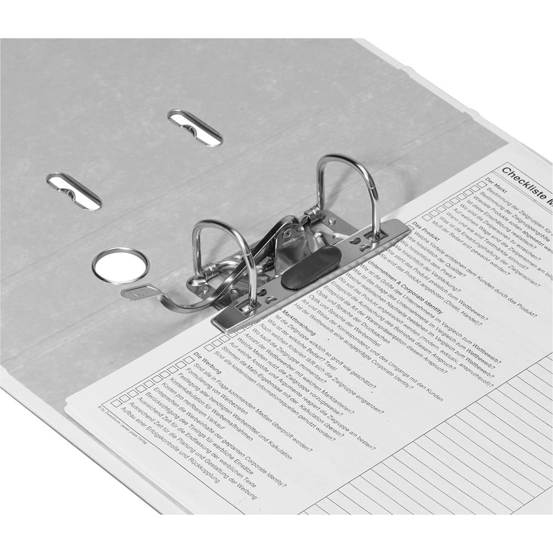 Das Ablegen der Dokumente gelingt dank Qualitäts-Hebelmechanik ganz leicht. Die einsortierten Dokumente werden sicher zusammengehalten und Sie haben jederzeit uneingeschränkten Zugriff darauf. Für einen sicheren Halt des Ordnerdeckels sorgen die platzsparenden Raumsparschlitze. Diese sind metallverstärkt und unterbinden zudem ein versehentliches Aufklappen.