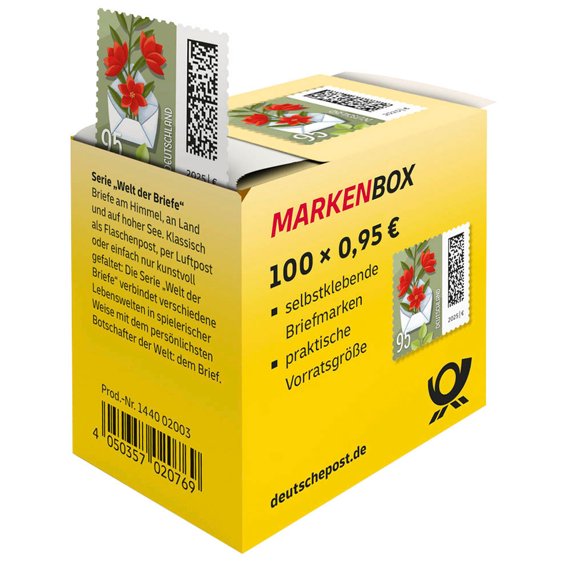 Die 100 Briefmarken mit dem Motiv Blumenbrief sind selbstklebend. Das heißt, Sie können sie einfach abziehen und an die vorgesehene Stelle kleben. Fertig ist Ihre Sendung für den Postversand.