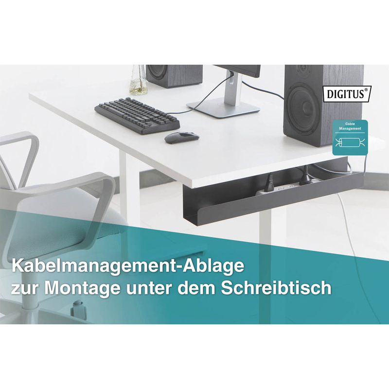 Der hochwertige Kabelkanal von DIGITUS sorgt für ein aufgeräumtes Arbeitsumfeld. Gefertigt aus robustem Metall in edlem schwarz, lässt sich der 60,0 cm Kabelkanal ganz einfach unter der Schreibtischplatte montieren und bietet ausreichend Platz für Kabel, Netzteile und Mehrfachsteckdosen.