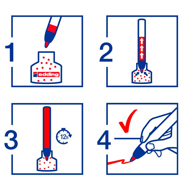 Die geruchsarme Tinte ermöglicht eine angenehme Nutzung auch über einen längeren Zeitraum hinweg. Dieses Produkt wird empfohlen für fast alle Materialien wie Holz, Metall, Glas, Plastik oder Karton.