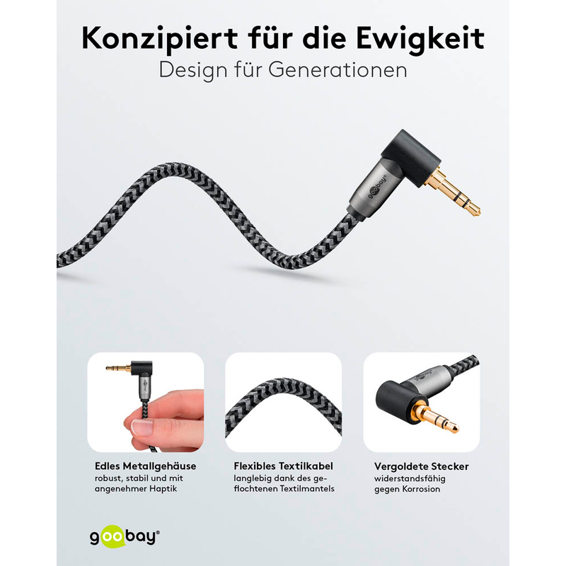 Diese besonderen Eigenschaften stecken im goobay 3,5 mm Klinke Klinkenkabel 1,0 m silber, schwarz, 1 St.: Ein Stecker hat einen 90°-Winkel, Textilkabel.