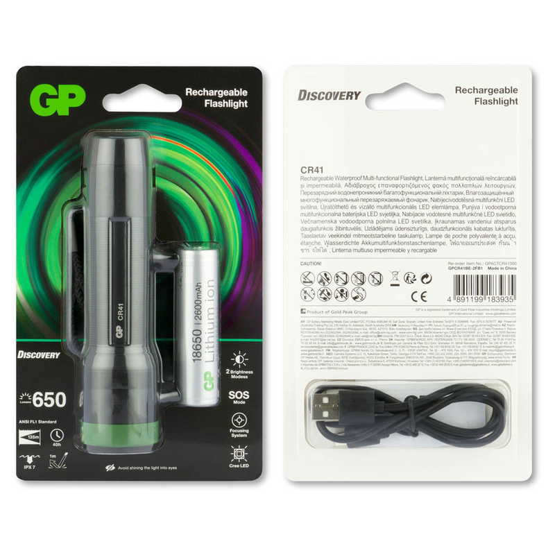 Bei Bestellung der GP Taschenlampe CR41 erhalten Sie die Lieferung inklusive Li-Ion Akku 18650, USB-Kabel, Handgelenkschlaufe.
