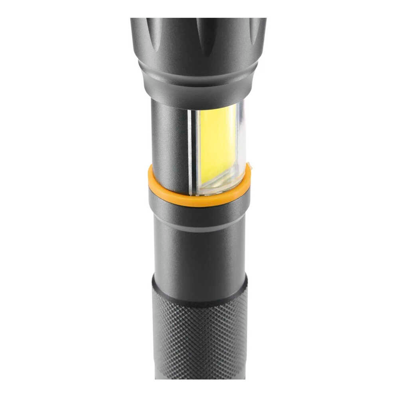 3 Leuchtstufen: eine weiße LED mit hellem Licht, gedimmtes Licht und Blinklicht, Zoom-Funktion (verstellbarer Lichtkegel von Nah- und Fernbereich), zusätzlich aktivierbare COB-LED