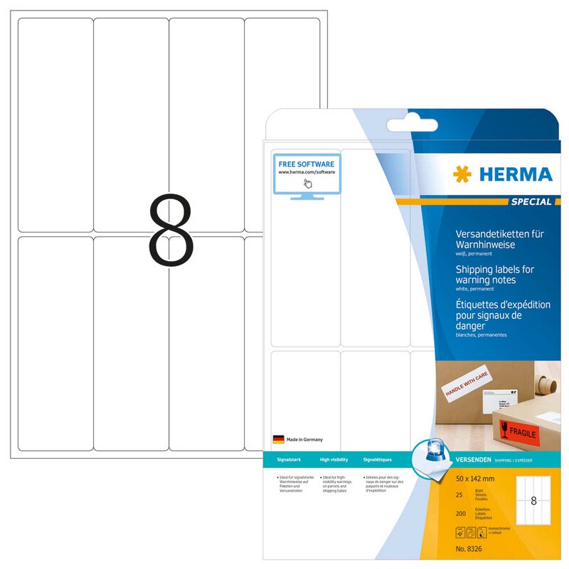 Die HERMA Versandetiketten SPECIAL sind optimal geeignet für Kopierer, SW-Laser, InkJet. Angeordnet sind die Exemplare auf einem A4-Bogen.