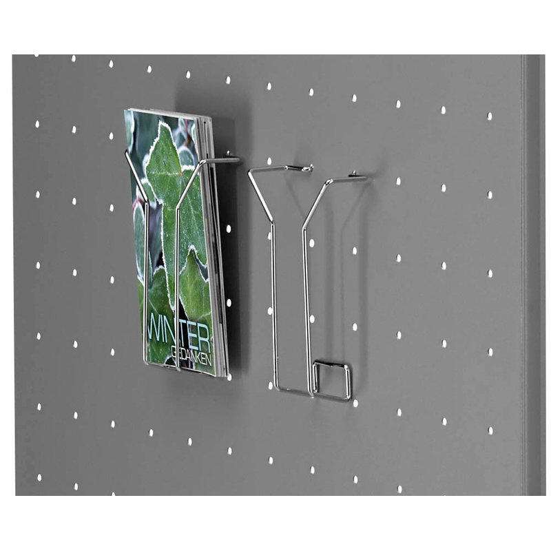 Die Anbringung der Prospektfächer ist kinderleicht und in Sekundenschnelle erledigt. Einfach die Prospektfächer in die kleinen Löcher der Frontplatte der Thekenelemente stecken. Fertig!
