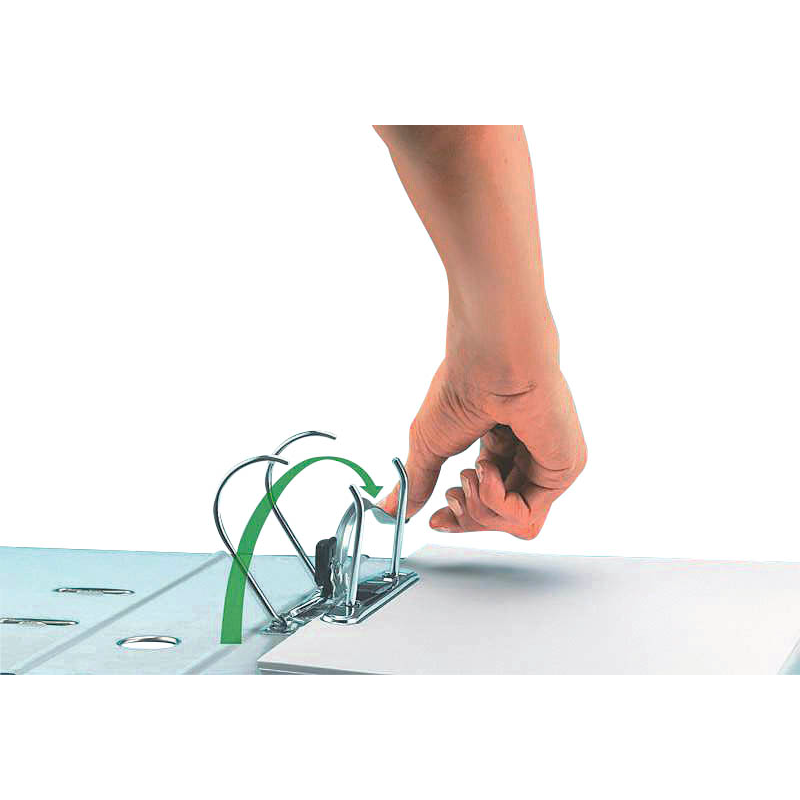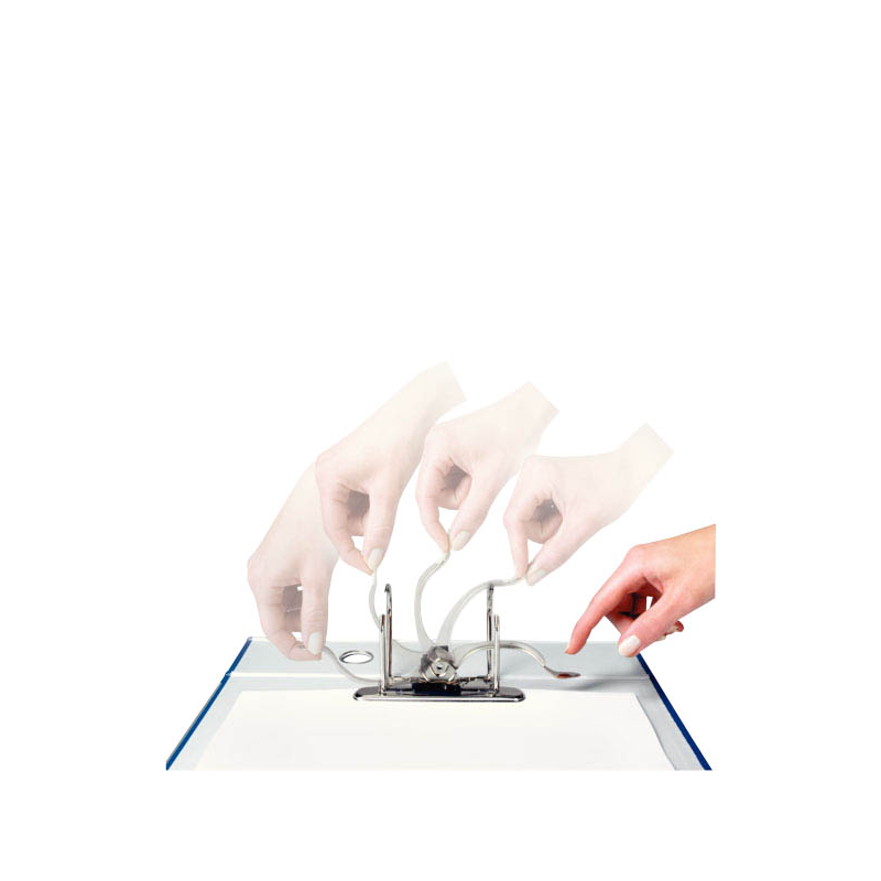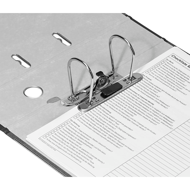 Die integrierte 180°-Mechanik, ermöglicht Ihnen das Befüllen und Entnehmen der Dokumente sowohl von links als auch von rechts. Dabei wird der Hebel komplett umgelegt und die Halteklammern öffnen sich auf eine komfortable Breite. Das erleichtert die Handhabung bedeutend. Für garantiert angenehmes Handling und platzsparendes Verstauen sorgen die länglichen Öffnungen mit Metallummantelung im Deckel – auch Raumsparschlitze genannt.