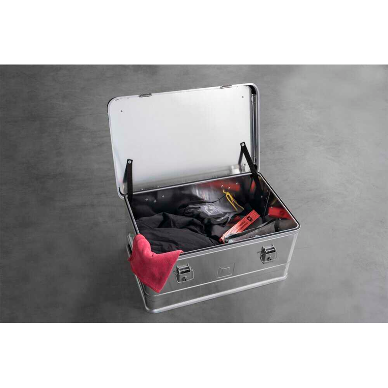 | Besonderheiten | umlaufende Sicken, mehrfach vernietete Scharniere, Rundum-Dichtung im Randprofil zum Schutz vor Staub und Feuchtigkeit, Klappverschlüsse aus Edelstahl mit Vorrichtung für Vorhänge- oder Zylinderschloss, schlagfeste Kunststoffecken, ergonomische Tragegriffe, robust und stabil |