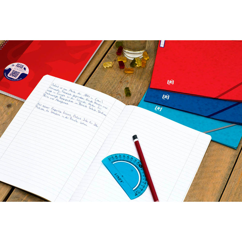 Das Schulheft von OXFORD ist ein echter Klassiker. Auf seinem hochweißen, tintenfesten und seidenglatten Optik-Papier steht das Schriftbild sehr schön und klar. Die Blätter können Sie sehr gut beidseitig beschriften, da die Tinte bei einer Papierstärke von 90 g/qm nicht durchschlägt.