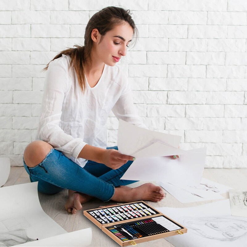 | Setumfang | Malkoffer (Buchenholz), Anspitzer, Radiergummi, 10x Farbstifte, 2x Bleistifte, Mischpalette, 3x Pinsel, 12x Wasserfarben, 24x Künstlerfarben |
