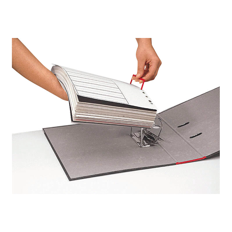 - Bündelungsbügel durch vorgestanzte Ordner-Lochung ziehen