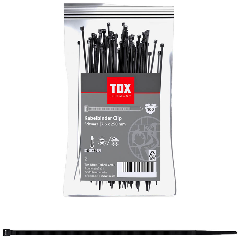 Die TOX Kabelbinder Clip schwarz 250,0 mm x 7,6 mm, 100 St. bieten eine zuverlässige Lösung für professionelle und sichere Kabelbefestigung.